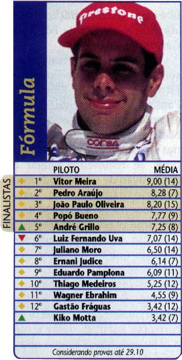 Mesmo não tendo participado de todas as corridas do campeonato, mas com essas atuações foi eleito o SEGUNDO melhor piloto de Fórmula do paÁs, perdendo apenas para Vitor Meira, que a época corria na Fórmula 3 Sulamericana. Ficando a frente de pilotos como João Paulo Oliveira (Japão), Popó Bueno (Stock Car), Juliano Moro (Stock Car), Duda Pamplona (Stock Car) e até do campeão mundial de kart em 1995, Gastão Fráguas. E com isso o ano 2000 não foi o que querÁamos, mas ele pode mostrar como se adaptava muito rápido e fácil aos novos desafios.
