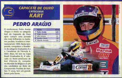 Tudo isso que aconteceu em 1999 o consagrou como o MELHOR PILOTO DE KART do paÁs, ganhando o Capacete de Ouro, prêmio dado pela revista Racing aos melhores piloto do paÁs. Sem contar suas presenças constantes e marcantes nas 500 Milhas de Kart, onde disputava em pé de igualdade com Rubinho, Massa, Giaffone e toda turma grande do automobilismo nacional e internacional. Que emoção e felicidade daquele dia!!! Deus reservou esse ano para ele, só ele!