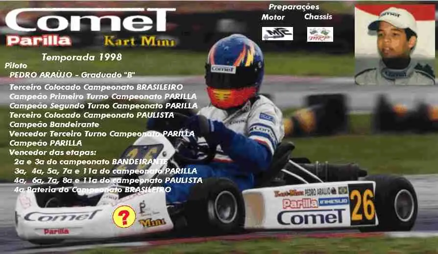 Começamos 1998 em uma nova equipe e categoria, dessa vez já na Graduados “Bâ€, esperança renovada e muita água correu por baixo da ponte entre 1997 e 1998…mas lá estávamos nós para mais um ano, e que solidificou seu nome entre os melhores pilotos em atividade da época. Foi Campeão Paulista de Fórmula PARILLA, Campeão Bandeirante, terceiro colocado no Campeonato Paulista de Kart, ganhando 5 das 11 corridas disputadas (esse Campeonato Paulista merecia um capitulo a parte, porque só quem esteve envolvido sabe como foi perdido e porque foi perdido, mas tudo que envolve seres humanos e dinheiro vai dar merda, e deu!!!). O Campeonato Brasileiro desse ano, Fortaleza – CE, foi do jeito que os Deuses quiseram mesmo…na classificação ele marcou o 3º tempo. Na primeira bateria, quando estava liderando, a 12 voltas do fim seu motor quebrou…ahhh como ele conseguia fazer o impossÁvel virar possÁvel. Largando 21º na segunda bateria ele chegou em 7º a menos de 1 segundo do 6º colocado. Na terceira bateria, mais uma vez fez chover e chegou na 3ª posição. Na quarta e última bateria, já podem até imaginar a posição de chegada né? Primeiro lugar, com mais de 1 reta de vantagem para o segundo colocado, quem nem saiu na foto. Isso eram os Deuses preparando-o, porque iria precisar de toda essa força de superação lá na frente! E assim terminou o brasileiro, terceiro colocado, a apenas 5 pontos do primeiro…mas superando pilotos como Allan Khodair, Nelson Merlo, Roberto Streit e Augusto Farfus.