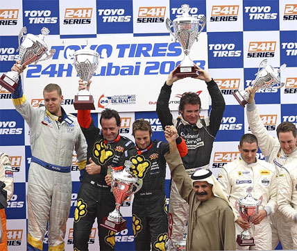 O quarteto Tony Quinn/ Clark Quinn/ Greg Baird/ Jonathan Webb, num Porsche 997 RSR da VIP Pet Foods, venceu neste sábado a 3º edição das 24 Horas de Dubai.