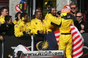 Na Sprint Race Yoong assumiu a liderança depois de um acidente na primeira curva entre a Nova Zelândia, que largou na pole-position, e a Alemanha, segunda no grid. O neozelandês Jonny Reid bateu no alemão Nico Hülkenberg, que acabou indo para na grama, batendo na barreira de proteção, abandonando na hora. Reid foi para os boxes, mas depois de uma inspeção dos comissários da prova, os danos no carro foram muitos ele também abandonou. Com a pista livre Yoong venceu a prova, de 20 minutos, com o Canadá, de James Hinchcliffe, em 2º e a França, com Nicolas Lapierre, fechando o pódio. O chinês Congfu Cheng, em 4º, conquistou o melhor resultado do paÁs na A1GP. O Brasil, com Christiano “Tuka†Rocha foi o 10º colocado. Com a vitória Yoong garantiu a pole-position para a Feature Race. Na largada para a Feature Race, de 70 minutos de duração, o canadense James Hinchcliffe, segundo no grid, assumiu a ponta depois da segunda curva, deixando Yoong em 2º. O novato piloto do Canadá manteve uma pequena vantagem sobre o malaio, que não perdia contato com o lÁder. Na 32º volta, Yoong forçou a ultrapassagem tocando em Hinchcliffe na curva 8. O canadense rodou e Yoong assumiu a liderança da corrida. Com os pneus sujos o carro canadense acabou sendo superado também pela República Tcheca, com Tomas Enge, o México, com Salvador Duran, e a Alemanha, com Nico Hülkenberg, terminando em 5º. Yoong venceu pela 3º vez na A1GP, com 7s336 de vantagem sobre Enge. Os mais de 28 mil espectadores presente ao autódromo, deliraram com o pódio do piloto tcheco. Cristiano “Tuka†Rocha terminou em 14º com o carro brasileiro. A Alemanha lidera o campeonato com 20 pontos, seguida pelo México, com 19 e a Malásia, com 17. O Brasil ainda não pontuou. A 3º etapa da temporada acontece no dia 12 de novembro, nas ruas de Beijing, na China.