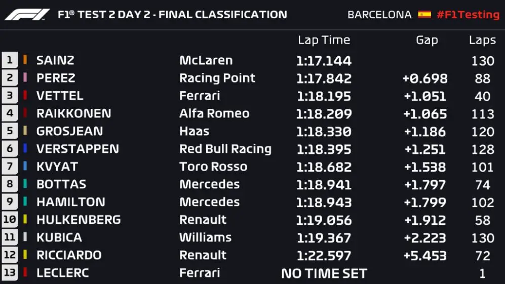 Com isso Carlos Sainz, da McLaren, fez a melhor volta da corrida dessa quarta-feira – e de todos os dias de testes até agora – com o tempo de 1:17.144 na sessão da manhã, Á frente de Sergio Perez, Racing Point, e Vettel, Ferrari.