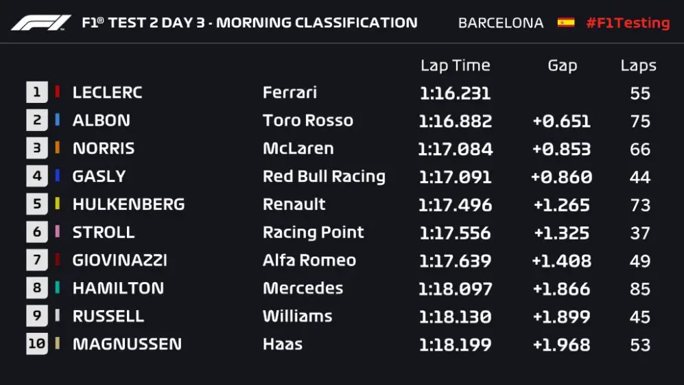 Charles Leclerc colocou a Ferrari de volta ao topo da tabela de tempos na manhã de teste em Barcelona. Com a volta mais rápida do ano, 1:16.231 e pneus mais macios.