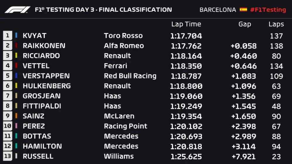 Sebastian Vettel, Ferrari, que dominou o primeiro dia de treinos, terminou em quarto, com 134 voltas, poucas a mais que Raikkonen com 138 e Kvyat com 137. Max Verstappen, Red Bull, completou os cinco primeiros em seu segundo dia de testes.