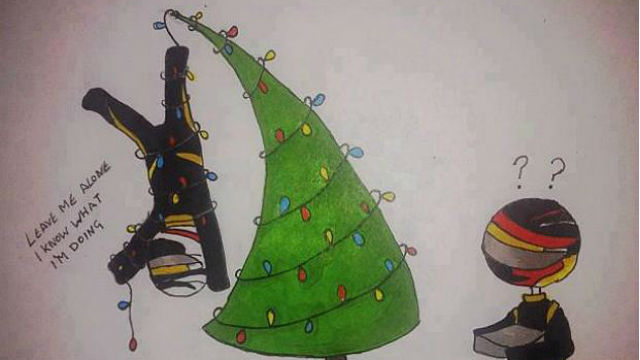 Em um desenho publicado em sua página do Facebook, Kimi Raikkonen aparece pendurado ao lado de uma árvore de Natal, enrolado e preso pelo pé por luzinhas, repetindo a célebre frase “Deixe-me em paz, eu sei o que estou fazendoâ€. Na imagem, o francês Romain Grosjean, seu companheiro na equipe Lotus, assiste Á cena com pontos de interrogação desenhados sobre sua cabeça.