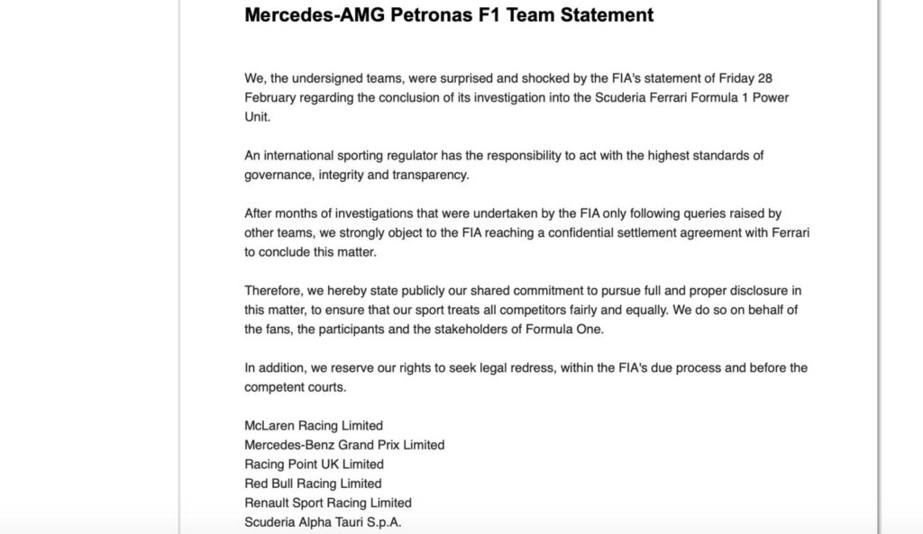 “Após meses de investigações realizadas pela FIA apenas após pedidos feitos por outras equipes, somos fortemente contra que a FIA chegue a um acordo confidencial com a Ferrari para concluir esse assuntoâ€, completaram.