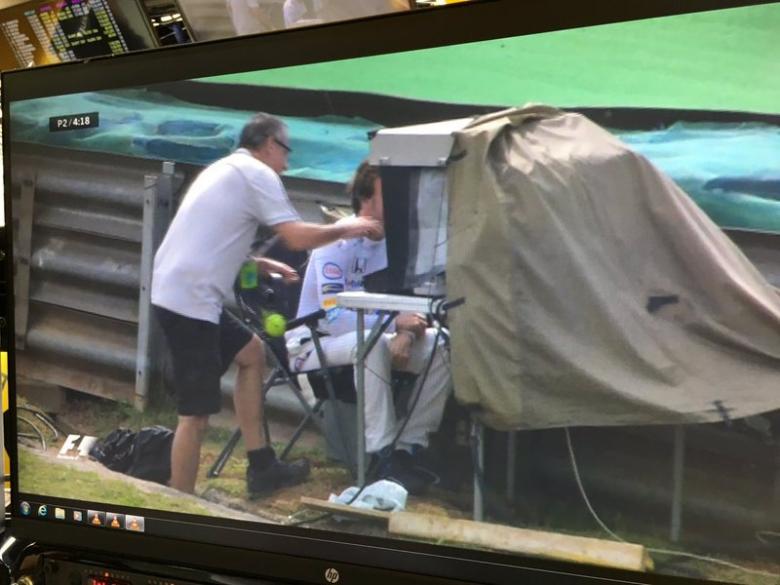 Após ter problemas mecânicos em sua McLaren, e receber ajuda dos comissários de pista, para colocar o carro em uma área segura da curva dois, o bicampeão providenciou um pedra, para calçar o carro.