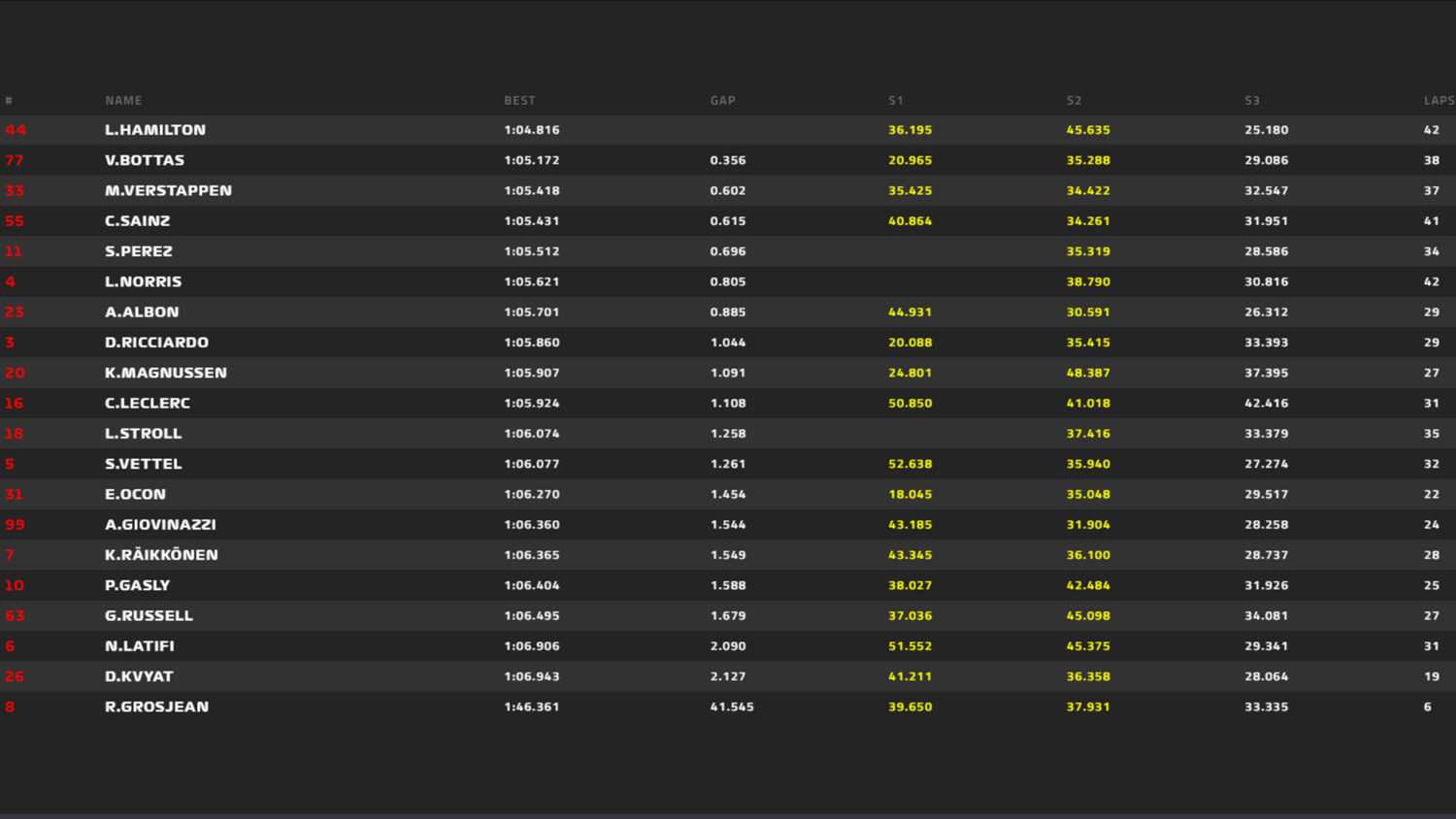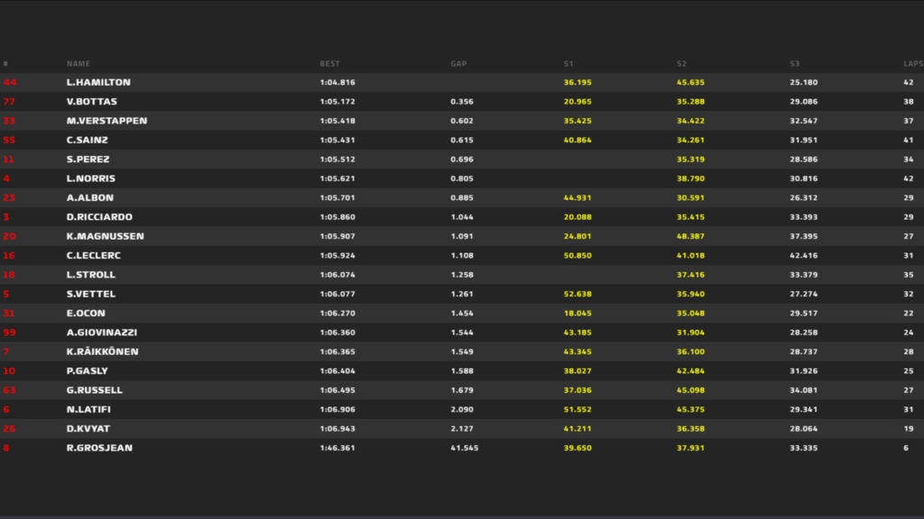 O tempo de Hamilton, 1:04.968, foi definido com pneus macios, assim como Bottas e Verstappen. Foi um poderoso cartão de visitas para o atual campeão, retornando Á Fórmula 1 no topo e liderando a tabela de tempos do treino.