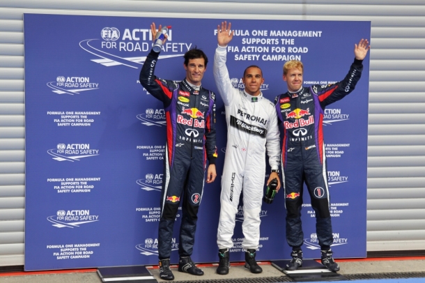 O alemão Sebastian Vettel (Red Bull) completa a primeira fila. O australiano Mark Webber (Red Bull) e Rosberg dividem a segunda fila.