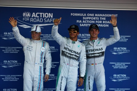 O alemão Nico Rosberg completa a dobradinha da Mercedes. O finlandês Valtteri Bottas (Williams) alinha em terceiro, seguido pelo britânico Jenson Button (McLaren).