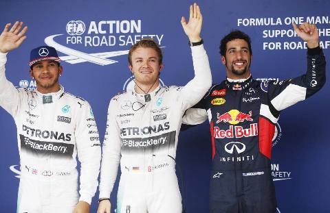 O brasileiro Felipe Massa (Williams) alinha em sétimo, seguido pelo holandês Max Verstappen (Toro Rosso). Â O espanhol Fernando Alonso (McLaren) e o francês Romain Grosjean (Lotus) Â completam os dez primeiros.