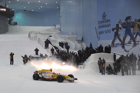 “Guiar um F1 na neve foi realmente espetacular. Nunca imaginei que teria uma oportunidade dessas, mas o Renault Roadshow é um grande sucesso exatamente por preparar surpresas como essas para o público”, revelou Nelsinho Piquet. Para protagonizar manobras na neve artificial do Ski Dubai, o R28 foi equipado com pneus Bridgestone especialmente adaptados para a situação. Os mecânicos da ING Renault levaram 16 horas para montar 2016 tachinhas de alumÁnio nos pneus. O carro ainda teve a sua suspensão elevada e mudanças no assoalho, tudo para que Nelsinho Piquet protagonizasse manobras espetaculares andando na neve. “Deu muito trabalho, mas foi incrÁvel”, resumiu Nelsinho.
