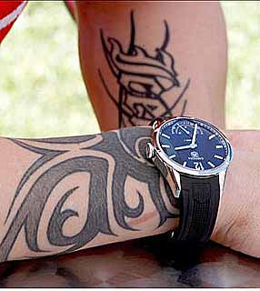 O finlandês Kimi Raikkonen apareceu hoje, no circuito de Melbourne, com uma nova tatuagem. No antebraço esquerdo do piloto da Ferrari, agora há a inscrição “Iceman” (Homem de Gelo), apelido pelo qual é conhecido na Fórmula 1.