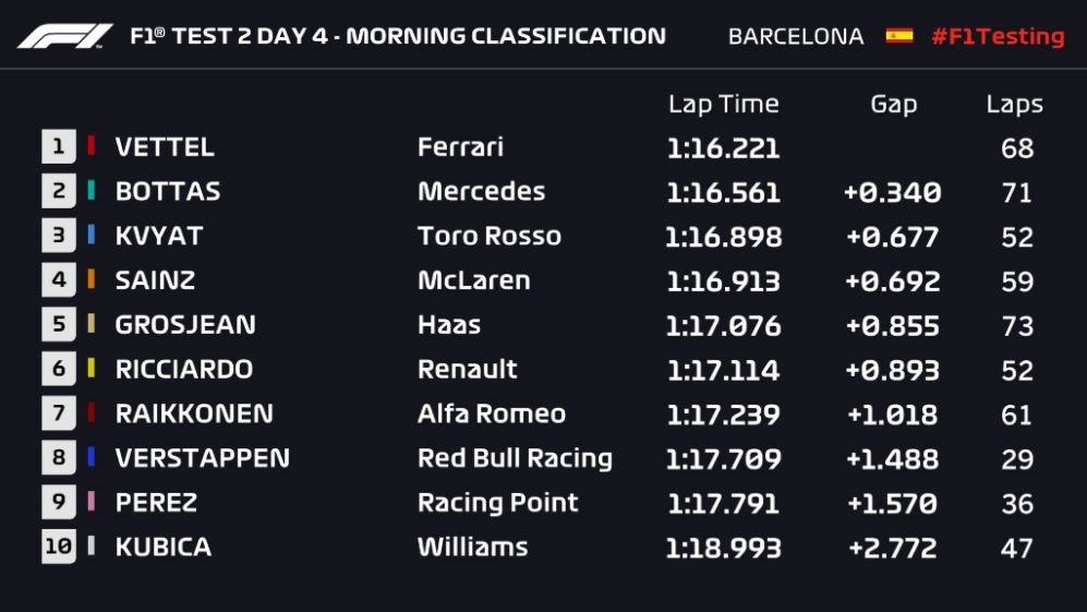 Sebastian Vettel manteve a Ferrari no topo da tabela de tempos antes da pausa para o almoço do último dia de testes de pré-temporada 2019, e de ainda estabeleceu um novo recorde de testes para o circuito. A Mercedes finalmente mostrou um pouco do que seu carro é capaz de fazer, mas ficando cerca de três décimos de segundo atrás do alemão.