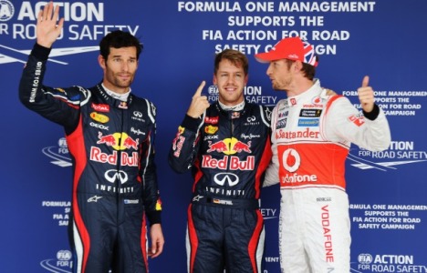 O australiano Mark Webber, em 2º, completa a dobradinha da Red Bull. Para delÁrio dos japoneses, Kamui Kobayashi (Sauber) alinha em 3º, seguido pelo francês Romain Grosjean (Lotus). O mexicano Sergio Pérez (Sauber) divide a terceira fila com o lÁder do campeonato, o espanhol Fernando Alonso (Ferrari).