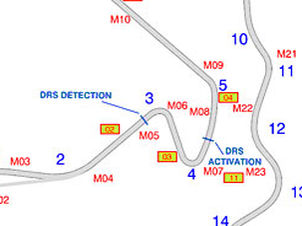 Os pilotos, se estiverem a menos de um segundo do carro da frente, utilizarão a asa móvel 45 metros após a curva 4. A linha de medição está a posicionada a 25 metros da curva 3.