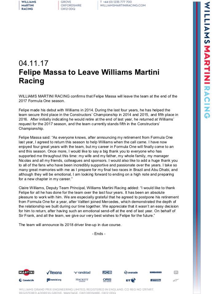 Neste sábado, o brasileiro Felipe Massa afirmou que não irá continuar na Fórmula 1 em 2018. O anúncio foi feito pelo próprio piloto na sua conta pessoal do Twitter e do Instagram, onde postou um vÁdeo de agradecimento a todos que o apoiaram durante os 15 ano de carreira e que estava encerrando de vez a sua carreira na Fórmula 1. Logo após a Williams soltou uma nota confirmando a não extensão de contrato e que agradecia por todo o trabalho realizado junto com a construtora.
