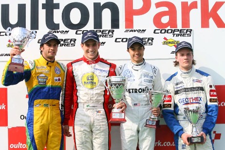 O brasileiro Lucas Foresti (Fortec) venceu neste sábado (23/04), em Oulton Park, na Inglaterra, a primeira prova da segunda etapa da temporada. Felipe Nasr (Carlin) completou a dobradinha brasileira. O malaio Jazeman Jaafar (Carlin) completou o pódio.