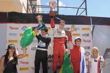 O fim de semana da oitava e última etapa da F4 Sul-americana, realizada no autódromo de Concórdia, na Argentina, foi perfeito para Bruno Baptista. O brasileiro, campeão antecipado na primeira corrida com um segundo lugar, disputou a segunda prova neste domingo com o objetivo de se divertir. E, largando da quinta posição, realizou uma prova excepcional e conquistou sua quarta vitória na categoria. Felipe Ortiz e Diego Muraglia completaram o último pódio da temporada. Vencedor da primeira corrida, disputada sábado, AgustÁn Lima Capitao foi apenas o quarto colocado.