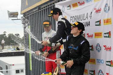 Felipe Ortiz venceu neste domingo a segunda prova da rodada dupla de abertura da temporada 2014 da F4 Sul-americana (Sudam), realizada em Mercedes, no Uruguai. O paulista registrou seu nome como o primeiro brasileiro a ganhar uma corrida na nova categoria do automobilismo, além de comandar a festa verde e amarela em solo uruguaio. Os compatriotas Bruno Baptista e Enzo Bortoleto completaram o pódio. Além da vitória, Ortiz assumiu a liderança do campeonato com 40 pontos, três Á frente de Baptista.