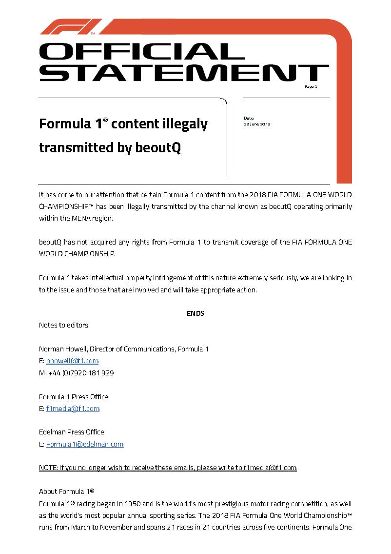 “A BeoutQ não adquiriu nenhum direito da Fórmula 1 para transmitir a cobertura do Campeonato Mundial de Fórmula 1. A Fórmula 1 leva a violação de propriedade intelectual dessa natureza extremamente a sério. Estamos analisando a questão e aqueles que estão envolvidos e tomaremos as medidas apropriadasâ€, informou a Liberty Media, em um comunicado oficial.