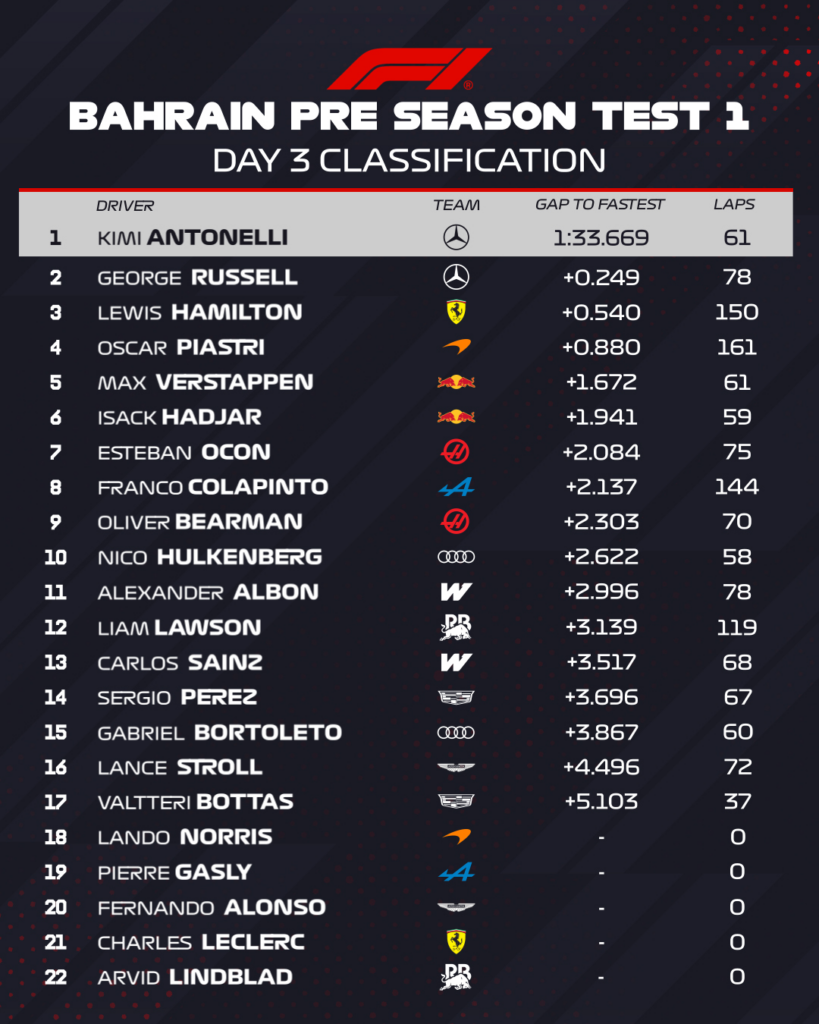 Fórmula-1: Confira os tempos do terceiro dia de testes coletivos no Bahrain
