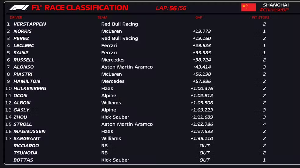 Pole-position Verstappen só perdeu a liderança (entre as voltas 14 e 20) durante a sua primeira parada nos boxes. Ele parou novamente durante o segundo Safety-Car, mantendo a ponta. No final venceu com tranquilos 13s779 de vantagem sobre Norris. Foi a primeira vitória de Verstappen no GP da China.