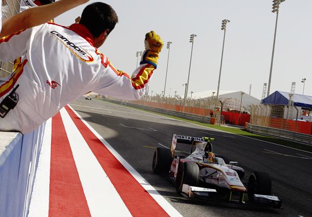 O indonésio Rio Haryanto (Campos Racing) venceu neste sábado (19/04), no circuito de Sakhir, no Bahrein, a prova curta da primeira etapa da temporada. O belga Stoffel Vandoorne (ART Grand Prix) e o francês NathanaÁ«l Berthon (Lazarus) completaram o pódio.