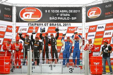 Durou um ano e cinco meses o jejum de vitórias da dupla Allam Khodair e Marcelo Hahn. Neste perÁodo, foram dezoito corridas e sete segundos lugares – uma espera angustiante que terminou neste sábado (9), na corrida de abertura da temporada do Itaipava GT Brasil, no circuito de Interlagos, em São Paulo. Eles venceram a primeira corrida do fim de semana de forma dominante, logo na estreia do novo carro, um Lamborghini Gallardo LP600.