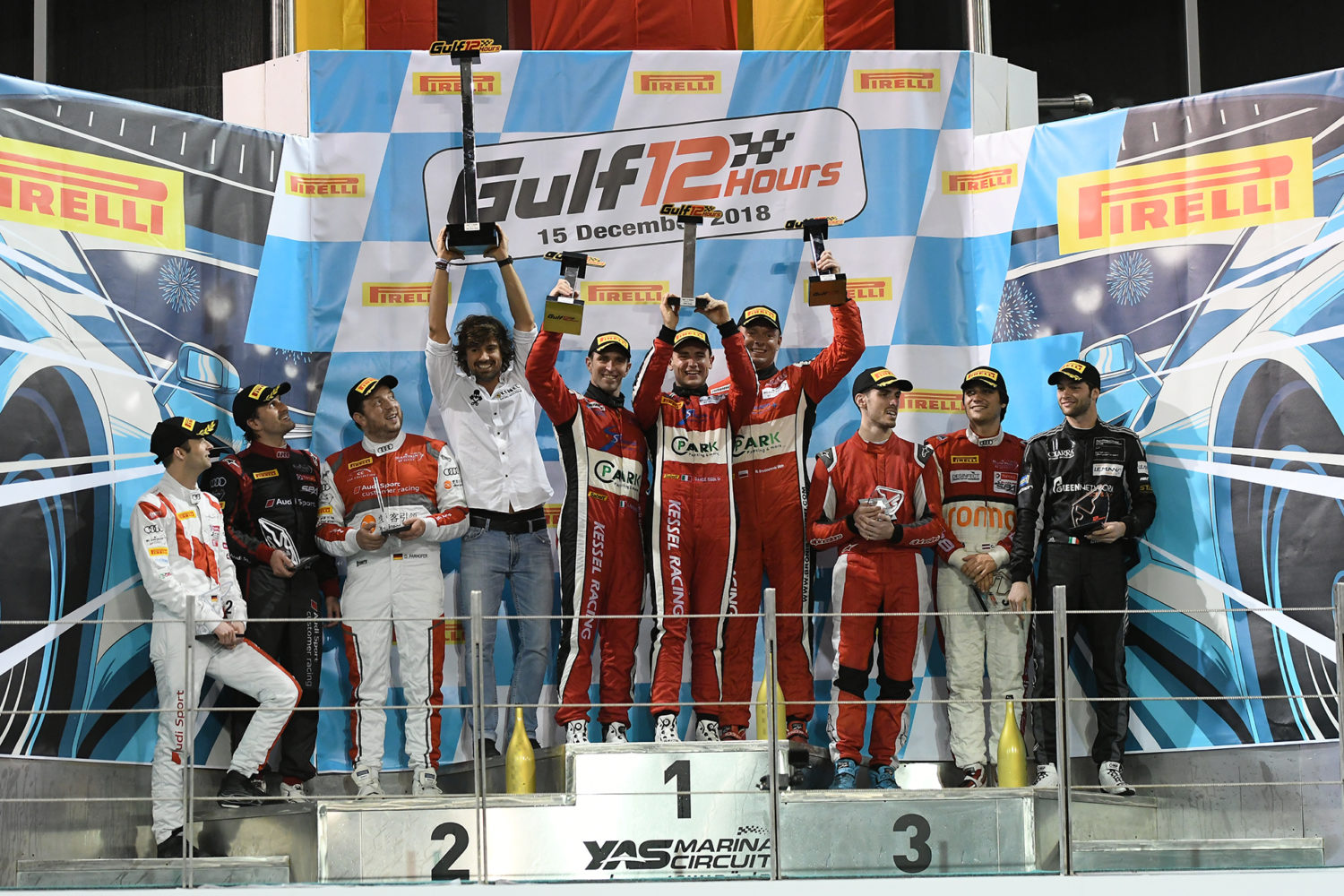 O trio Michael Broniszewski/Davide Rigon/Alessandro Pier Guidi, na Ferrari 488 GT3 #11 Kessel Racing, venceu no sábado (15/12) a oitava edição da Gulf 12 Hours, no Circuito de Yas Marina, nos Emirados Árabes Unidos. Foi a quarta vitória consecutiva da equipe na prova.