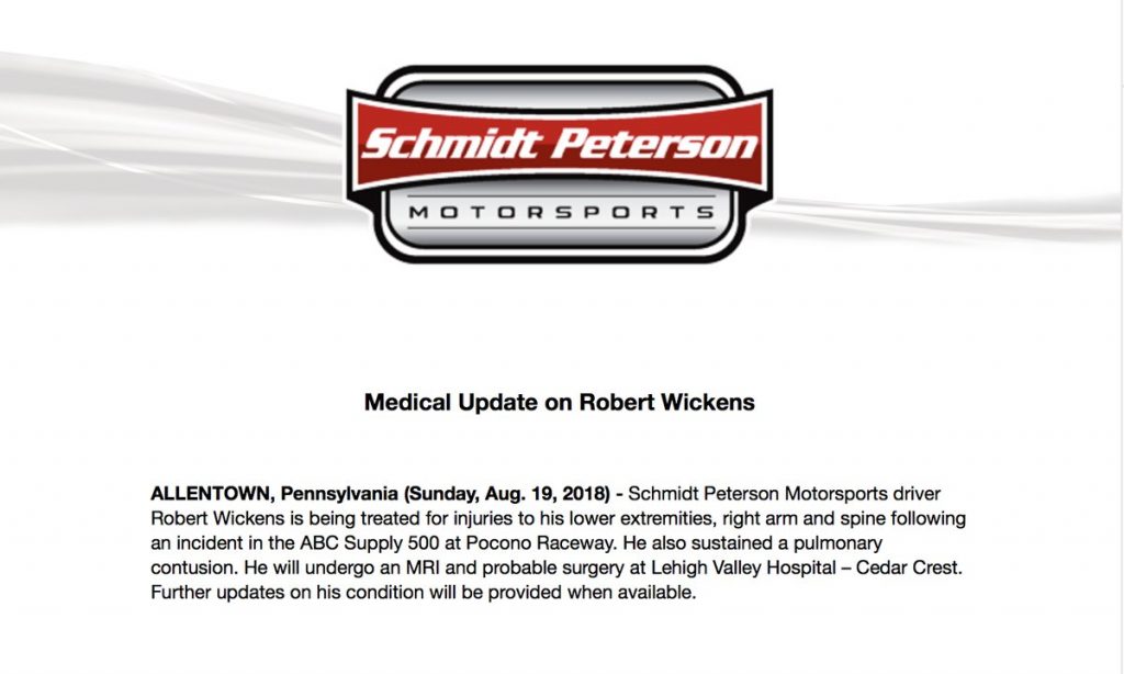 “O piloto da Schmidt Peterson Robert Wickens está sendo tratado por lesões nas pernas, no braço direito e na coluna vertebral depois do acidente nas 500 Milhas de Pocono. O piloto também sofreu uma contusão pulmonar e vai passar exames de imagem e provavelmente por cirurgia no Hospital Lehigh Valley Medicalâ€, escreveu.