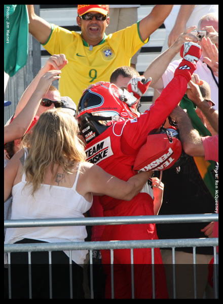 E como Sonoma não tem alambrado, Helinho inovou mais uma vez, ao pular a pequena cerca divisória e ir comemorar, de capacete e tudo, no meio da torcida brasileira.