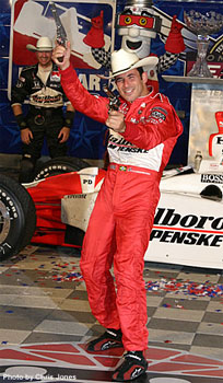 Helio Castroneves esteve sempre na cola de Wheldon e assumiu a liderança da prova nas últimas voltas, depois da terceira parada nos boxes. E como de costume fez valer o seu apelido de “Homen-Aranha†escalando o alambrado do circuito.