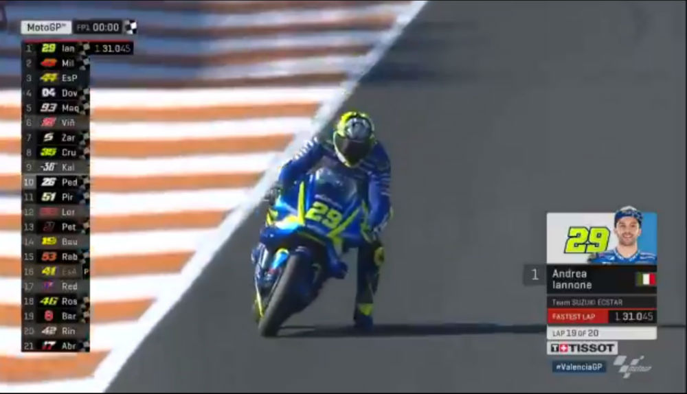 Nesta sexta-feira foi realizado a primeira sessão de treinos da etapa de Valência, pelo Moto GP, e o piloto da Suzuki, Andrea Iannone, teve o melhor desempenho com tempo de 1:31.045, na parte da manhã. O italiano conseguiu a melhor volta já na reta final do treino, faltando cerca de três minutos. Os dois pilotos que disputam o tÁtulo, Dovizioso e Marc Marques, fecharam a sessão com a quarta e quinta melhor parcial, respectivamente.