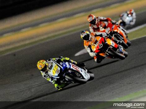 Pouco depois Stoner se recuperou da largada ruim, recuperando a liderança e abrindo vantagem em busca da sua quarta vitória consecutiva no Catar. Contudo, na sexta volta, o campeão de 2008 perdeu o controle de sua moto e caiu, deixando a ponta para Rossi.
