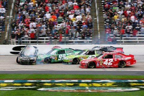 Faltando 17 voltas para o final um múltiplo acidente acionou a bandeira vermelha, que permaneceu por vinte minutos. Jeff Gordon, que havia liderado 124 voltas, tocou no Chevrolet de outro parceiro de equipe, o pole-position da prova, Tony Stewart, na curva quatro. Stewart acertou o muro, voltando para cima de Gordon, que foi colhido por Carl Edwards (Ford), iniciando uma reação em cadeia que envolveu Juan Pablo Montoya (Chevrolet), Joey Logano (Toyota), A.J. Allmendinger (Ford), Paul Menard (Ford), Clint Bowyer(Chevrolet)Â e Jamie McMurray (Chevrolet).
