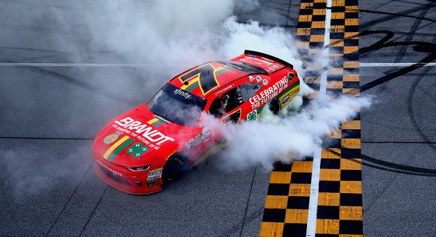Com um “empurrão†de Sadler, seu parceiro na JR Motorsports, Allgaier superou Erik Jones (Toyota) e Ryan Blaney (Ford) e assumiu a ponta na curva um, na penúltima relargada, na 186ª volta. Pouco depois bandeira amarela foi acionada pela última vez. Allgair manteve a ponta na relargada, faltando sete voltas para o final, recebendo a bandeirada com 1s772 de vantagem sobre Larson, piloto regular da Cup Series.