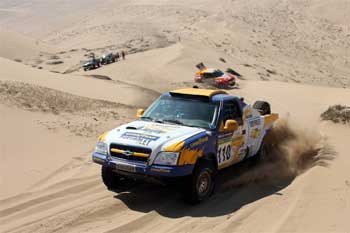 Os irmãos Marlon e Joseane Koerich, do Chevrolet Rally Team, passaram bem pelas famosas dunas de Copiapó, no Deserto do Atacama, no Chile. A dupla completou a sétima etapa do Mundial de Cross Country, o Por Las Pampas Rally, na 6ª posição, se mantendo em 2º na categoria T1.4 e passando para 5º na geral. A especial do dia teria 237 quilÁ´metros, mas a Federação Internacional de Automobilismo reduziu para 181.