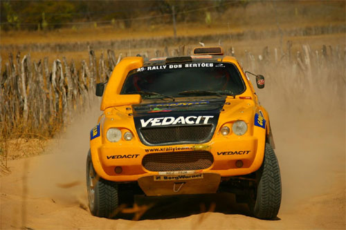 A etapa desta terça-feira do Rally Internacional dos Sertões, no interior do Oeste da Bahia, ligou as cidades de Barra e Lençóis. Um percurso bem diferente, regado a chuva fina, para apimentar a disputa da maior prova off-road da América Latina. A dupla Marcos Baumgart e Alessandro FabrÁcio, da equipe X Rally Team, recebeu um ingrediente a mais para a dose de adrenalina da prova. A mangueira do sistema de alimentação de combustÁvel soltou, despejando muito óleo. Na chegada, os mecânicos consertaram o problema e o carro já está pronto para a sétima etapa especial da quarta-feira (15).