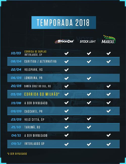 Mais importante e longeva categoria do automobilismo nacional, a Stock Car lança seu calendário com as 12 etapas de 2018. Marcada por inovações no último ano, esta temporada inicia com uma novidade em relação a 2017: o retorno da Corrida de Duplas.