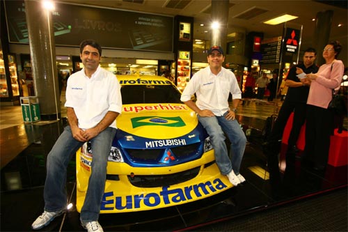 O automóvel Mitsubishi Lancer, da equipe Eurofarma-RC, é uma grande atração no saguão principal do aeroporto de Congonhas. O carro dos pilotos Cacá Bueno e AntÁ´nio Jorge Neto, campeão e vice-campeão brasileiros da Stock Car de 2006 despertou muito interesse de pessoas que só o vêem Á distância e em alta velocidade pelas pistas do PaÁs. A exposição teve inÁcio na última terça-feira, dia 19, com autógrafos e fotografias dos pilotos, e será encerrada amanhã Á noite, sexta-feira, dia 22.