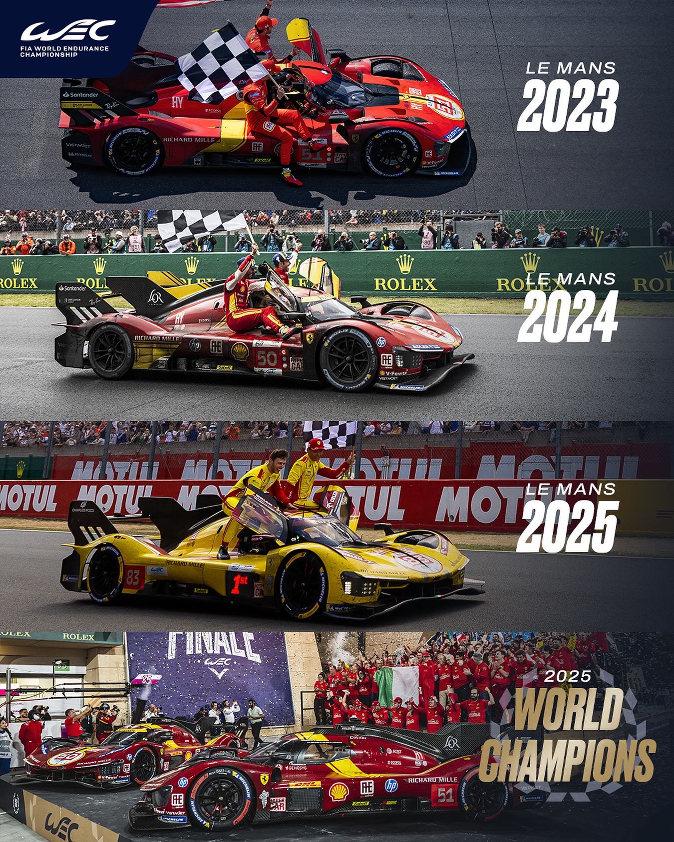 A Ferrari conquistou o título do Campeonato Mundial de Endurance na classe Hypercar (Hypercar World Endurance Manufacturers’ Championship), e também o de pilotos (Hypercar World Endurance Drivers’ Championship), com o trio formado pelo britanico James Calado e os italianos Antonio Giovinazzi e Alessandro Pier Guidi.