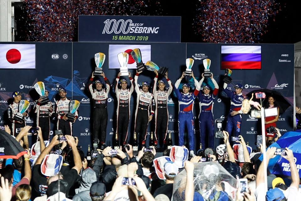 O trio formado pelo suÁço Sébastien Buemi, o japonês Kazuki Nakajima e o espanhol Fernando Alonso, no Toyota TS050 Hybrid #8, venceu as 1000 Milhas de Sebring, no Sebring International Raceway, sexta etapa da temporada 2018/2019 do Campeonato Mundial de Endurance (WEC). Foi a terceira vitória do trio no campeonato. O trio Mike Conway/Kamui Kobayashi/José MarÁa López, no Toyota TS050 Hybrid #7, completou a dobradinha da fábrica japonesa. O trio Mikhail Aleshin/Vitaly Petrov/Brendon Hartley (SMP Racing BR Engineering/AER) completou o pódio no geral e na classe LMP1.