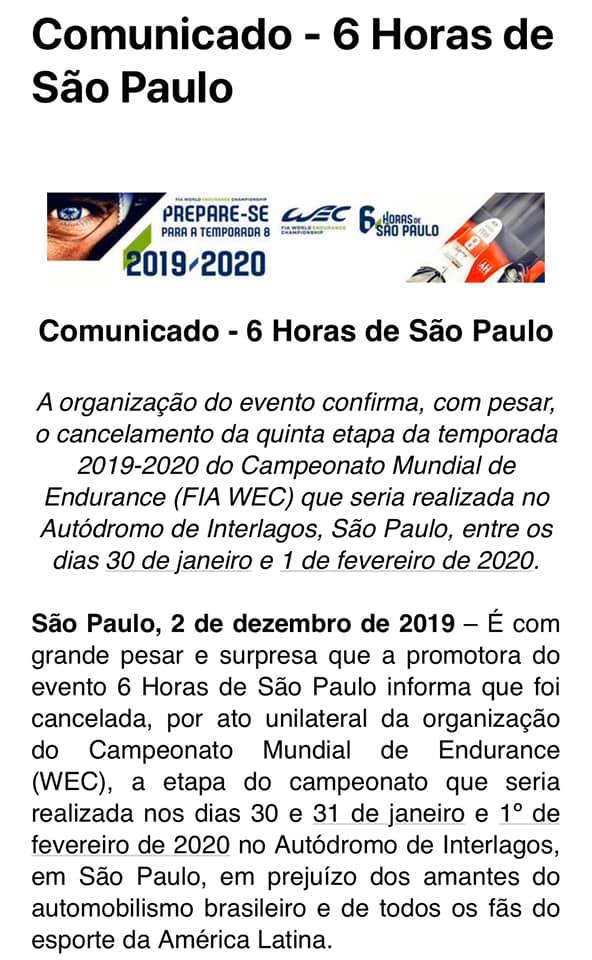 A organização do evento confirma, com pesar, o cancelamento da quinta etapa da temporada 2019-2020 do Campeonato Mundial de Endurance (FIA WEC) que seria realizada no Autódromo de Interlagos, São Paulo, entre os dias 30 de janeiro e 1 de fevereiro de 2020.